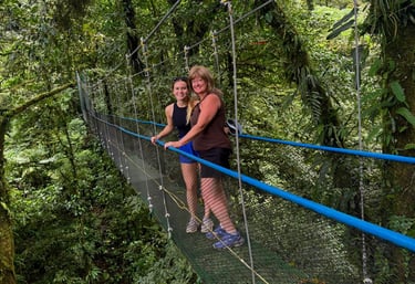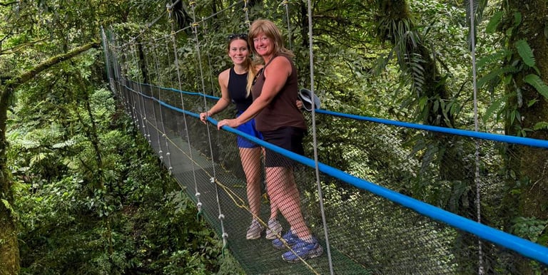 Walk across hanging bridges surrounded by lush rainforest and stunning views.